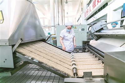 小麥變面粉,只是小麥“變身增值”之旅的開始。與面粉廠相隔不遠的是南街村鮮拌面廠,在展示大廳內,鮮拌面、麻辣涼面、火雞面、熱干面……琳瑯滿目的商品擺滿了柜臺。
